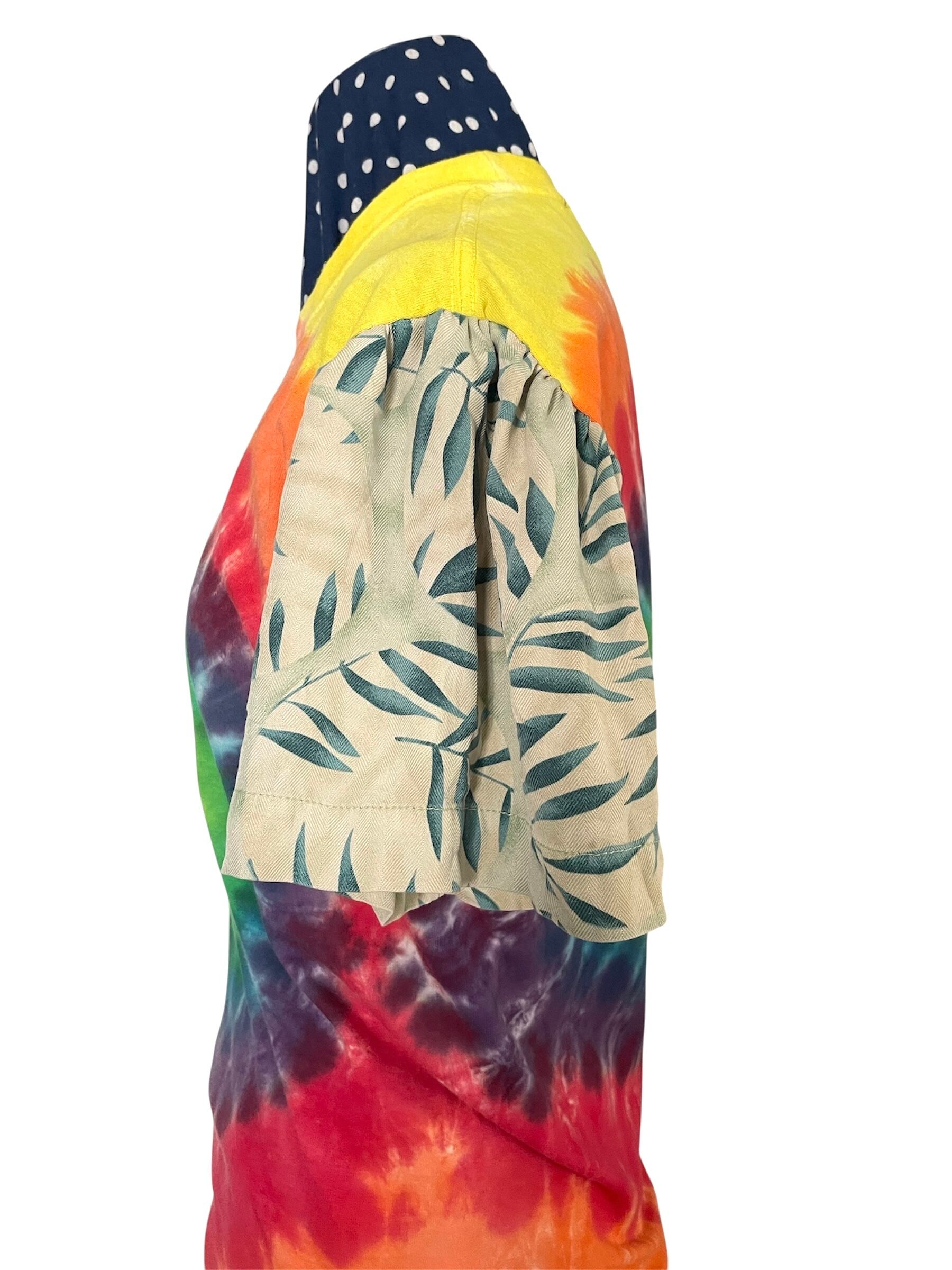 TIE DYE USED T SHIRT × SILK VINTAGE HAWAIIAN SHIRT SLEEVE REMAKE BLOUSE